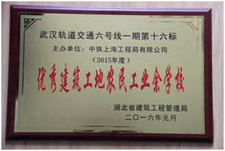 近日,從湖北省建筑工程管理局傳來喜訊,上海工程局市政公司武漢地鐵6號線16標項目部農(nóng)民工業(yè)校榮獲2015年度湖北省“優(yōu)秀建筑工地農(nóng)民工業(yè)余學?!狈Q號。