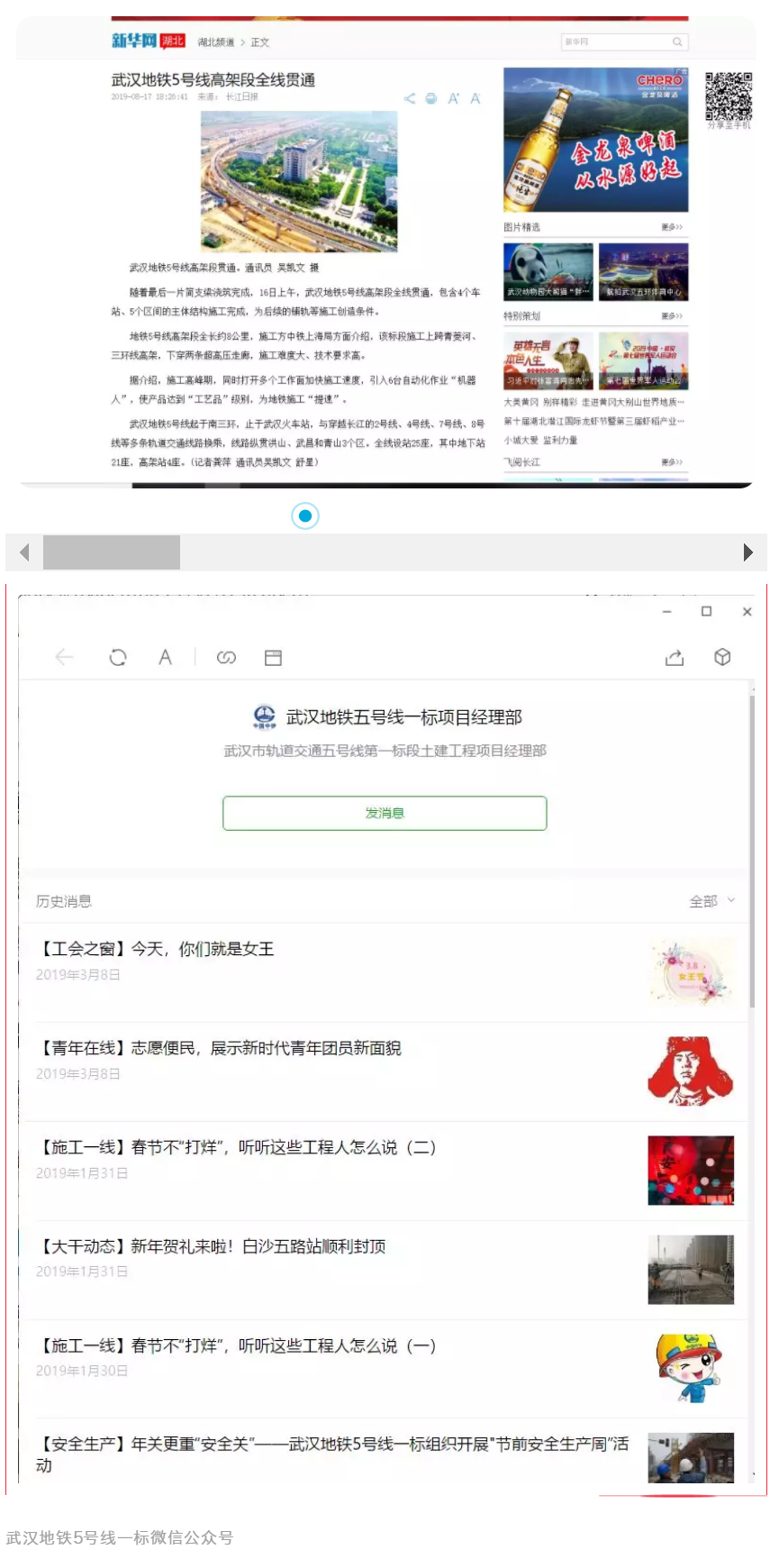武漢地鐵5號(hào)線一標(biāo)項(xiàng)目黨支部成立了由項(xiàng)目書記為組長(zhǎng)的宣傳工作領(lǐng)導(dǎo)小組,組織制定了項(xiàng)目宣傳工作年度計(jì)劃及獎(jiǎng)懲辦法。在《中鐵上海工程》報(bào)投稿工作方面,每月制定宣傳工作總結(jié)和下月工作計(jì)劃,截至目前已在《中鐵上海工程》報(bào)上刊稿6篇。在對(duì)外宣傳工作方面,在重大節(jié)點(diǎn)、人才培養(yǎng)、企業(yè)文化等方面深入挖掘,此外,黨支部還創(chuàng)辦了“武漢地鐵五號(hào)線一標(biāo)項(xiàng)目經(jīng)理部”微信公眾訂閱號(hào),每日上傳施工日?qǐng)?bào),并結(jié)合施工生產(chǎn)、黨建工作及企業(yè)文化等方面情況,開辟了大干動(dòng)態(tài)、黨群園地、信息速遞等欄目,第一時(shí)間推送微信信息,將微信公眾號(hào)打造成了展示項(xiàng)目文化的“窗口”。