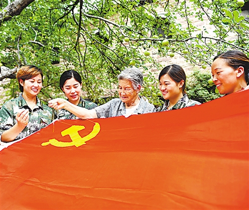 6月30日,中國歷史文化名村河北省沙河市王硇村開展“同心共筑中國夢(mèng) 紅色基因永傳承”主題活動(dòng),一位60年黨齡的老黨員帶領(lǐng)女子民兵班的民兵,一針一線將中國共產(chǎn)黨黨徽繡在鮮艷的紅旗上,以表達(dá)對(duì)黨的無限熱愛、對(duì)祖國的美好祝福。趙永輝攝